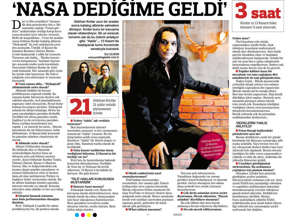 Dizi ve film müzikleri” denince ilk akla gelenlerden biri o. Bir zamanlar yaptığı “Uzaylı gördüm” açıklamaları ortalığı kasıp kavurunca kendini iyice işlerine vermişti. Belki de kırgınlıktan… Uzun bir aradan sonra Gökhan Kırdar katalog albümü “Diskografi” ile eski şarkılarıyla yeniden aramızda. Üstelik 13 Kasım’da İstanbul Bostancı Gösteri Merkezi’nde başlayacak 1 yıllık bir turneyle. Turnenin adı Aşkla… “Kırdar konser versin kampanyası” başlatan hayranları sonunda mutlu sonla kucaklaştı. Öncesinde Gökhan Kırdar ile stüdyoda buluştuk. Her zamanki gibi siyahlar içinde çıktı karşımıza. Bir kahve eşliğinde yeni albümünü ve turnesini konuştuk.