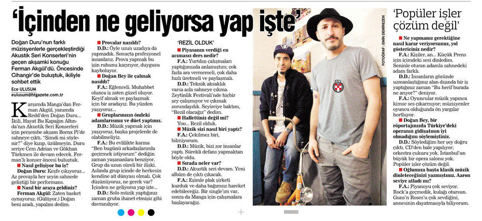 Karşımda Manga’dan Ferman Akgül, yanımda Redd’den Doğan Duru… İkili, Hayat Bu Kapağın Altında’nın Akustik Seri Konserleri için perşembe akşam Bornx Pi’de sahneye çıktı. “Şimdi mi söylenir?” diye kızıp, üzülmeyin. Duru seriye Cem Adrian ve Gökhan Türkmen ile devam edecek. Ferman’lı konser öncesi buluştuk.