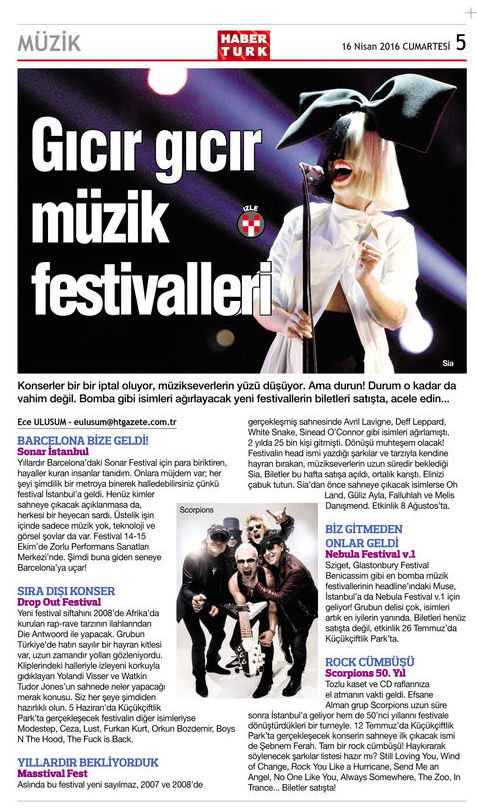 v.1 Sziget, Glastonbury Festival Benicassim gibi en bomba müzik festivallerinin headline’ındaki Muse, İstanbul’a da Nebula Festival v.1 için geliyor! Grubun delisi çok, isimleri artık en iyilerin yanında. Biletleri henüz satışta değil, etkinlik 26 Temmuz’da Küçükçiftlik Park’ta. ROCK CÜMBÜŞÜ Scorpions 50. Yıl Tozlu kaset ve CD raflarınıza el atmanın vakti geldi. Efsane Alman grup Scorpions uzun süre sonra İstanbul’a geliyor hem de 50’nci yıllarını festivale dönüştürdükleri bir turneyle. 12 Temmuz’da Küçükçiftlik Park’ta gerçekleşecek konserin sahneye ilk çıkacak ismi de Şebnem Ferah. Tam bir rock cümbüşü! Haykırarak söylenecek şarkılar listesi hazır mı? Still Loving You, Wind of Change, Rock You Like a Hurricane, Send Me an Angel, No One Like You, Always Somewhere, The Zoo, In Trance… Biletler satışta!