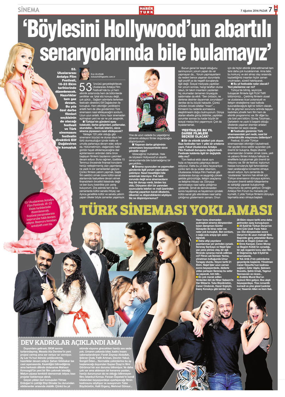 53’üncüsü gerçekleştirilecek Uluslararası Antalya Film Festivali’nde bu yıl hem etkinlik anlamında hem de bölümlerde yenilikler var. İptal söz konusu değil, çok şükür… Sağlam adımlarla ilerlerken festivalin direktörü Elif Dağdeviren ile konuştuk. Hem etkinliğin yeniliklerini anlattı hem de ülke gündeminin Türk sinemasını nasıl etkileyeceğini sordum. Uzun uzun anlattı. Konu hazır sinemadan açılmışken yeni ne var ne yok araştırdık.