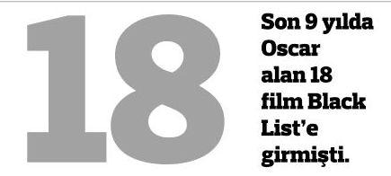 Black List’in en iyi orijinal senaryo ve en iyi uyarlama senaryo dalında nokta atış yaptığı filmleri sıralayalım. Juno’nun senaryosunu 2005’te listeye aldılar, 2008’de en iyi orijinal senaryoda Oscar aldı. Little Miss Sunshine 2005’te listeye girdi, 2007’de Oscar aldı, The Social Network 2009’da listeye girdi, 2011’de Oscar aldı, Spotlight 2013’te listenin başındaydı ve hem en iyi film hem de en iyi orijinal senaryo dallarında Oscar kazandı. Whiplash, The Revenant, Argo, The Descendants, Django Unchained ve daha birçok film… Black List’in her yıl yayınladığı listedeki senaryolar sinema şirketleri tarafından adeta ‘kanlı bir dövüş’ ile paylaşılıyor. Oyuncularsa bu filmlerde rol alabilmek için yapımcılara haber yolluyor.