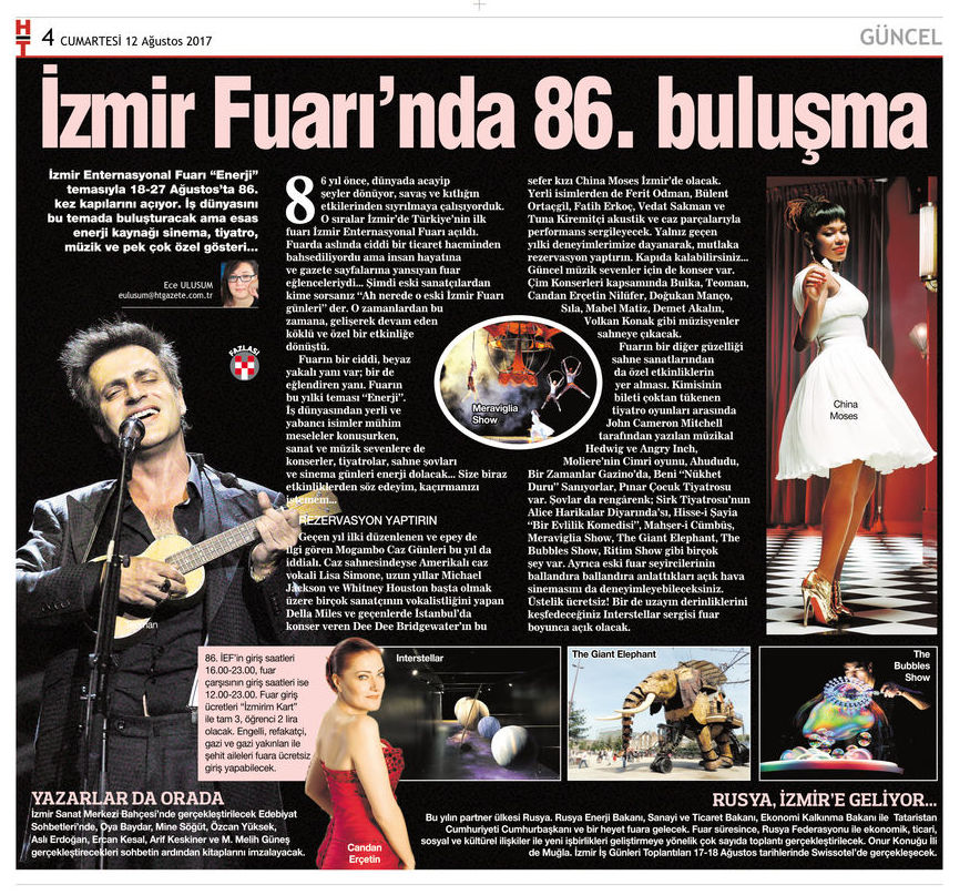6 yıl önce, dünyada acayip şeyler dönüyor, savaş ve kıtlığın etkilerinden sıyrılmaya çalışıyorduk. O sıralar İzmir’de Türkiye’nin ilk fuarı İzmir Enternasyonal Fuarı açıldı. Fuarda aslında ciddi bir ticaret hacminden bahsediliyordu ama insan hayatına ve gazete sayfalarına yansıyan fuar eğlenceleriydi… Şimdi eski sanatçılardan kime sorsanız “Ah nerede o eski İzmir Fuarı günleri” der. O zamanlardan bu zamana, gelişerek devam eden köklü ve özel bir etkinliğe dönüştü. Fuarın bir ciddi, beyaz yakalı yanı var; bir de eğlendiren yanı. Fuarın bu yılki teması “Enerji”. İş dünyasından yerli ve yabancı isimler mühim meseleler konuşurken, sanat ve müzik sevenlere de konserler, tiyatrolar, sahne şovları ve sinema günleri enerji dolacak… Size biraz etkinliklerden söz edeyim, kaçırmanızı istemem…