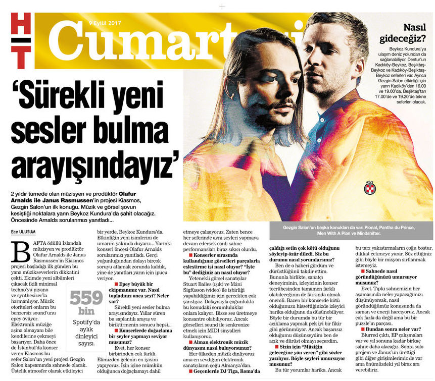 BAFTA ödüllü İzlandalı müzisyen ve prodüktör Olafur Arnalds ile Janus Rasmussen’in Kiasmos projesi başladığı ilk günden bu yana müzikseverlerin dikkatini çekti. Ekimde yeni albümleri çıkacak ikili minimal techno’yu piyano ve synthesizer’la harmanlıyor. Müzik otoriteleri onların bu benzersiz sound’unu epey övüyor. Elektronik müziğe aşina olmayanı bile kendilerine çekmeyi başarıyor. Daha önce de İstanbul’da konser veren Kiasmos bu sefer Salon’un yeni projesi Gezgin Salon kapsamında sahnede olacak. Üstelik atmosfer olarak etkileyici bir yerde, Beykoz Kundura’da. Etkinliğin yeni isimlerini de umarım yakında duyarız… Yarınki konseri öncesi Olafur Arnalds sorularımızı yanıtladı. Gerçi yoğunluğundan dolayı birçok soruyu atlamak zorunda kaldık, yine de yanıtları yarın için ipucu veriyor.