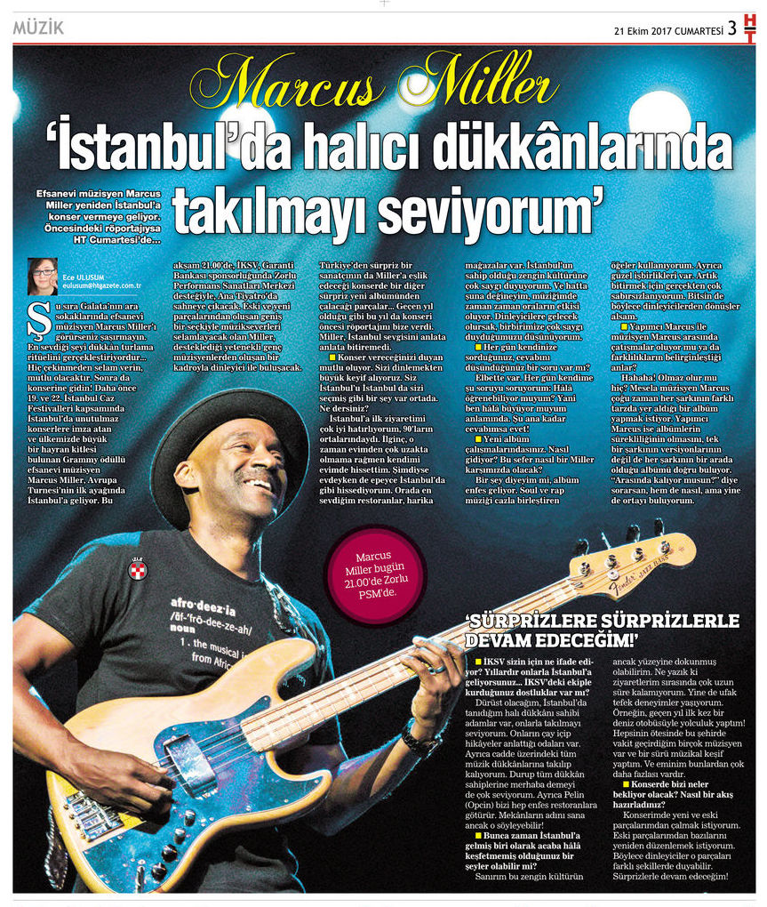 marcus millerŞu sıra Galata’nın ara sokaklarında efsanevi müzisyen Marcus Miller’ı görürseniz şaşırmayın. En sevdiği şeyi dükkân turlama ritüelini gerçekleştiriyordur… Hiç çekinmeden selam verin, mutlu olacaktır. Sonra da konserine gidin! Daha önce 19. ve 22. İstanbul Caz Festivalleri kapsamında İstanbul’da unutulmaz konserlere imza atan ve ülkemizde büyük bir hayran kitlesi bulunan Grammy ödüllü efsanevi müzisyen Marcus Miller, Avrupa Turnesi’nin ilk ayağında İstanbul’a geliyor. Bu akşam 21.00’de, İKSV, Garanti Bankası sponsorluğunda Zorlu Performans Sanatları Merkezi desteğiyle, Ana Tiyatro’da sahneye çıkacak. Eski ve yeni parçalarından oluşan geniş bir seçkiyle müzikseverleri selamlayacak olan Miller, desteklediği yetenekli genç müzisyenlerden oluşan bir kadroyla dinleyici ile buluşacak. HT Cumartesi’nden Ece Ulusum’un haberi… Türkiye’den sürpriz bir sanatçının da Miller’a eşlik edeceği konserde bir diğer sürpriz yeni albümünden çalacağı parçalar… Geçen yıl olduğu gibi bu yıl da konseri öncesi röportajını bize verdi. Miller, İstanbul sevgisini anlata anlata bitiremedi.